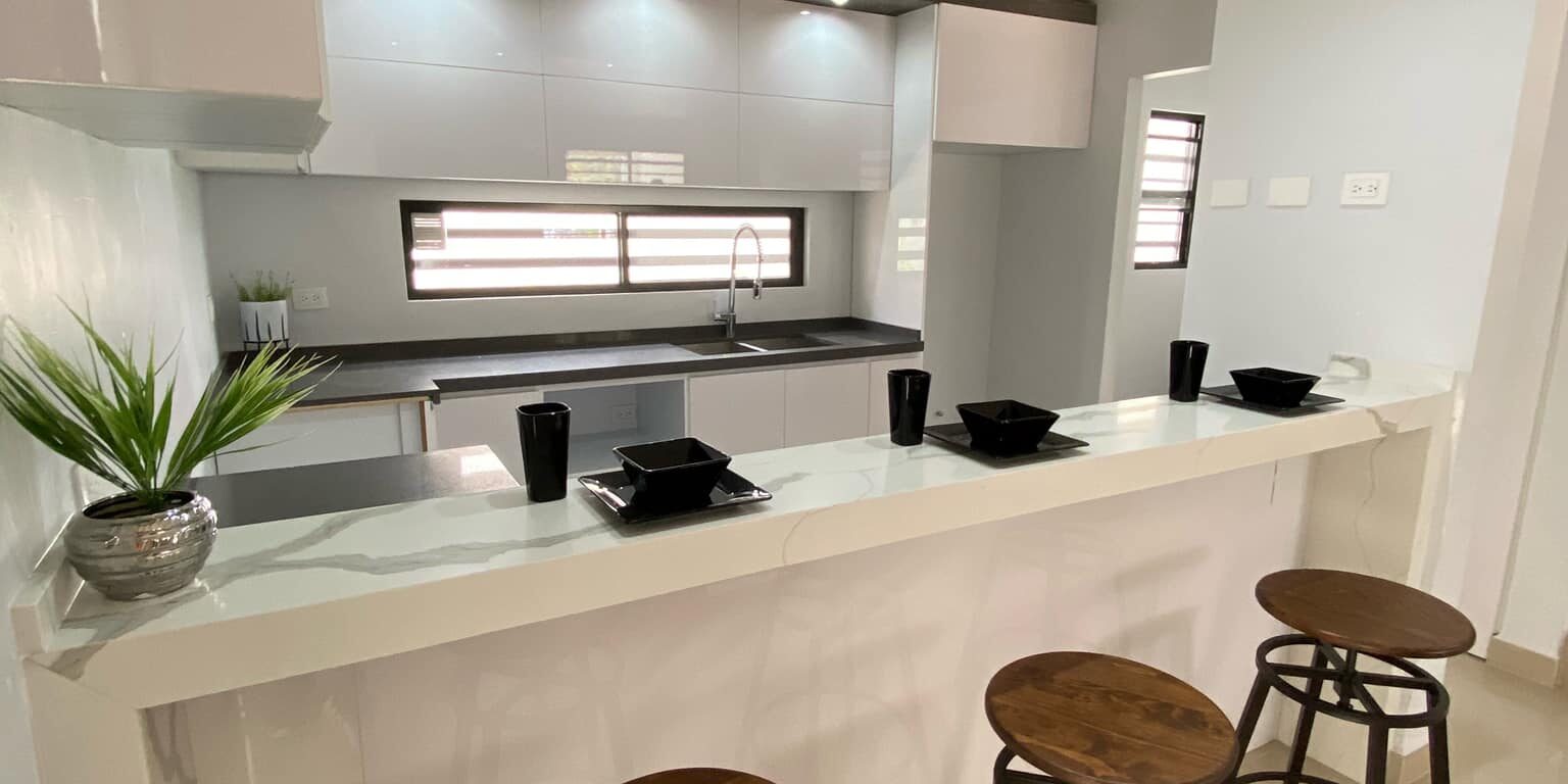 Barra tipo bar fabricada en estructura metálica forrada de cuarzo premium Calacatta