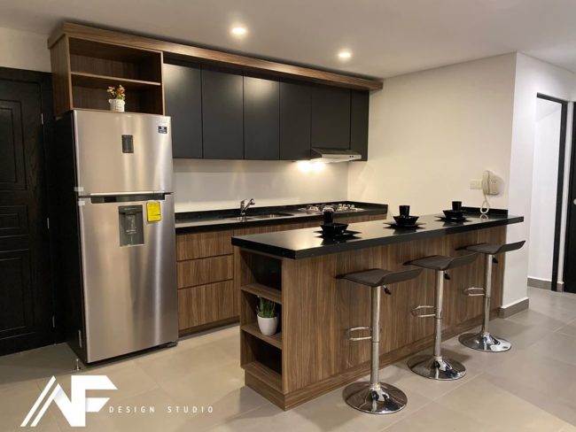 Cocina diseñada en color Nogal Neo combinado con negro mate y cubierta de Cuarzo black mirror.